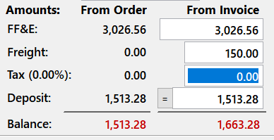 Best practices: If you are tracking payments to vendors (both deposits and final payments through the Enter Vendor Final Invoices steps), always enter any estimated or quoted freight amounts in the "Freight Quote" field on the Orders screen. This ensures that "estimated remaining" totals are as accurate as possible on the vendor payment reports. It also streamlines the entry of deposit requirements using the right-click shortcuts on that screen. Do the same for tax rates or tax estimates paid to the vendor if they apply to the order. |