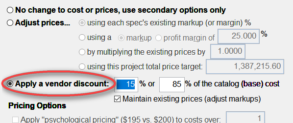 [New] For purchasing management projects, the Pricing Tool's "Apply a vendor discount" option is now available to apply a discount to the base cost to calculate a new "Net Cost." Other options are still disabled since no "price" is involved on this billing type.
