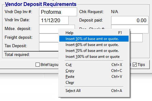 Note: The separate entries for freight and tax are for convenience in calculating individual components of the deposit (since you can right-click on them for common percentages). The "Total required" is a lump sum that is eventually applied to order items on a "first processed, first applied" basis, without regard for the type of expense.