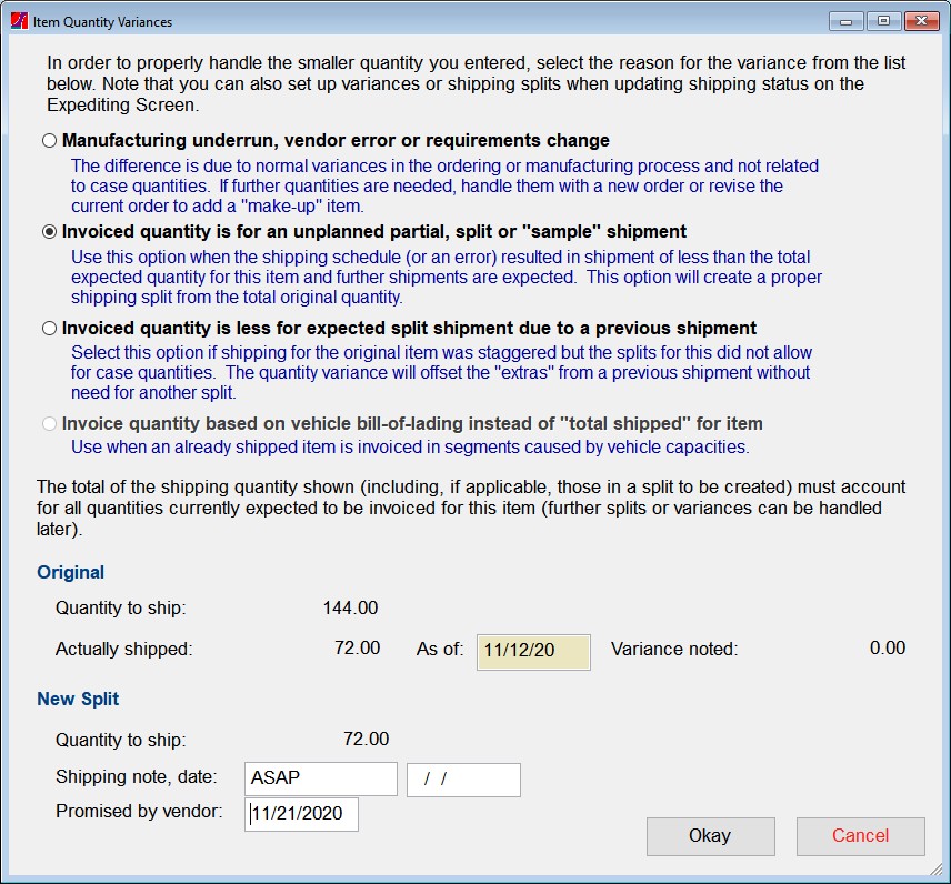 Please note: Iif you enter an item's known shipping quantity differences on the Expediting screen before processing a vendor invoice, you will see the resulting shipping split during this process and can select just the portion that was invoiced.