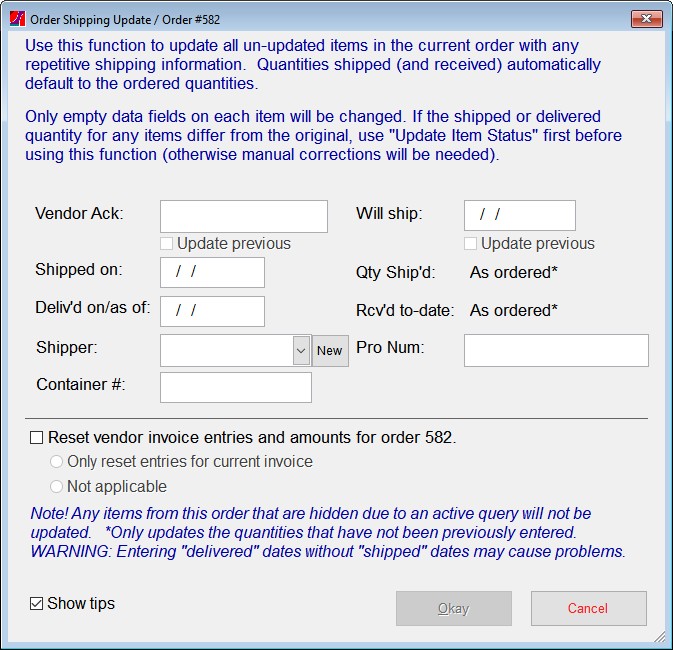 - Click Okay. When the utility closes, all invoice entries on the order items on that invoice will be cleared (only one order at a time is changed).
